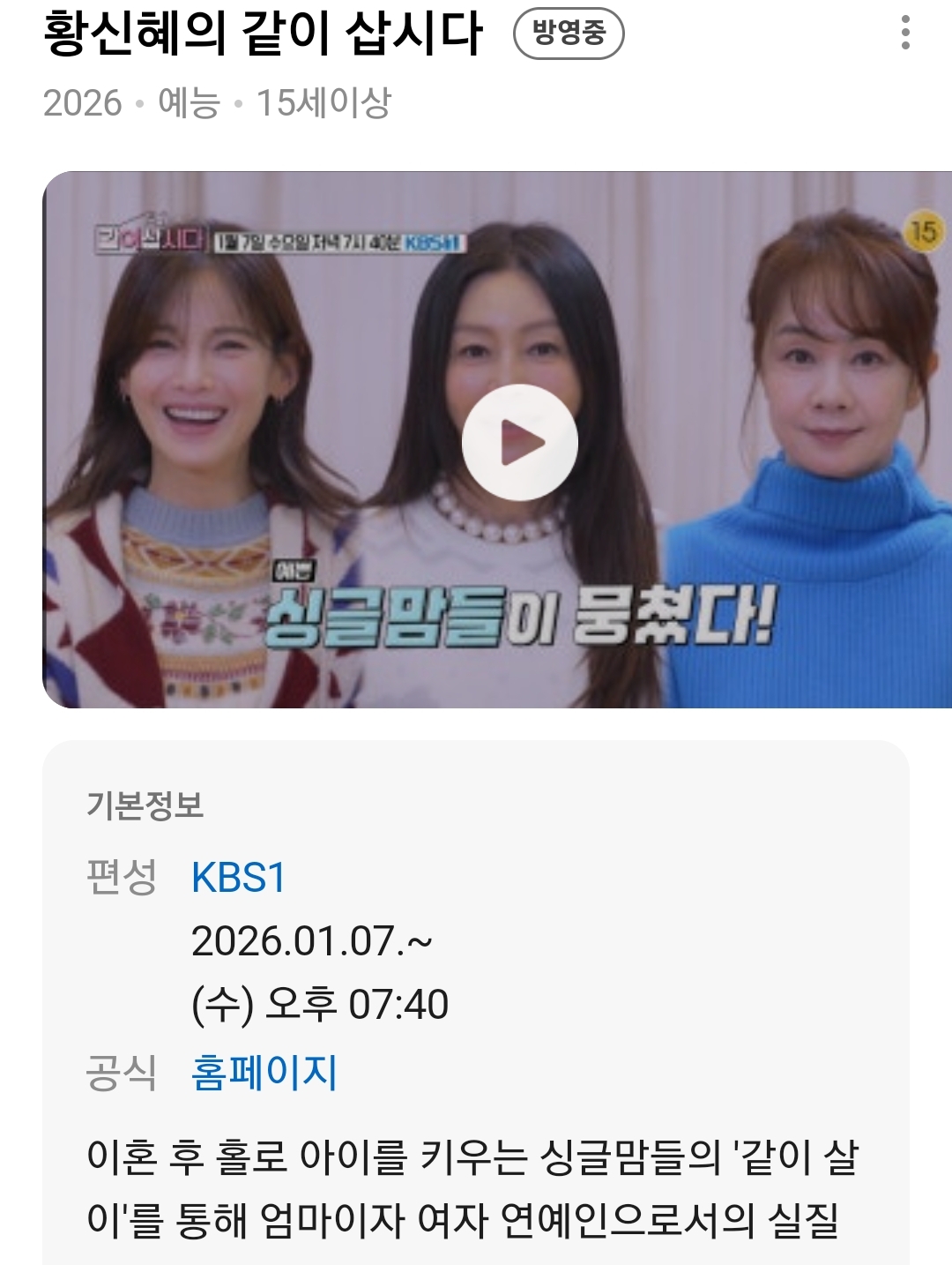 황신혜는 '황신혜의 같이 삽시다'에서 20대로 다시 돌아가고 싶지 않다는 진솔한 고백을 하며 눈물을 흘렸습니다. 세 사람은 싱글맘이라는 공통점으로 모여 딸들과의 관계와 각자의 인생 그래프를 나누며 깊은 공감과 연대감을 형성합니다. 정가은은 이혼 후 겪은 어려움을 솔직히 털어놓으며 황신혜와의 대화 속에서 위로를 나눕니다. 프로그램 마지막에는 의문의 선물이 도착하며 현장이 눈물바다로 변하는 감동적인 순간이 펼쳐집니다.
